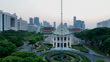 Aerial Drone Sunrise Scene of Bangkok skyline, Business city, view of Bangkok downtown, Flying over Bangkok, Thailand.
