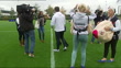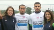 Ladies playing football at Spurs training ground / Players posing for photcall by goal with banner and large infallible ladies breasts / Tottenham Hotspur players along including Kyle Walker, Michael Dawson, JermainDefoe and AndrosTownsend and posing for photocall with others / Andre Villas-Boas posing for photocall with women footballers and holding 'Get to know cancer' t-shirt / Villas-Boas posing for photographs / Kyle Walker posing for photographs / Andros Townsend along and posing for photographs then putting on cancer awareness t-shirt / Walker putting on t-shirt / Photocall with Townsend and Walker and inflatable breasts and posing for individual photos with lady footballers / Townsend being interviewed by other news crew / Townsend's football boots with name printed on them / Number '17' on Townsend's shorts / Townsend's wristband / Townsend / Townsend wearing cancer t-shirt