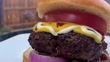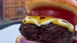 Big, tall, juicy burger on golden brioche bun stacked with thick red tomato, red onion, lettuce leaf, mayonnaise, ketchup, mustard sitting on table on square white plate during summer backyard barbecue