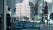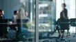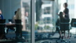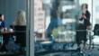 Business people meeting, group teamwork and manager talking, conversation and explain company strategy, planning or ideas. Leadership, window or boardroom team listening to project management report