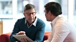 Businessman with tablet explains strategy to corporate partner (dolly shot)
