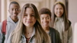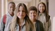 Niños, de vuelta al cole y juntos en el pasillo, sonrientes y listos para la clase, estudiantes y felices por la educación, positivos y amigos. Diversidad, retrato y grupo para el aprendizaje, el conocimiento y la adolescencia - Vídeo de stock 4K