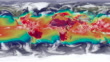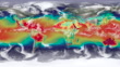 Heat map data model of the Earth's surface temperature (colours 270 to 310 Kelvin). The emission of heat via longwave radiation is shown by white, which in this case indicates cloud cover. Data set crucial to understanding weather systems and climate change. Credit NASA / Goddard Space Flight Centre