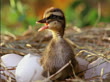 Close up mallard duckling squacking sitting in nest with broken eggshells - Vídeo de stock