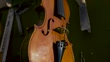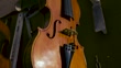 Close-up 4k stock video of a violin standing in a workshop with light shining on it