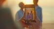 Closeup of Asian senior adult couple is photographed by a local female guide while traveling on vacation on beach enjoy sea at sunset light. Happy elderly people lifestyle after retirement concept.