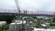 Workers dismantle a crane at a commercial construction job site.