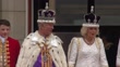 King Charles III and Queen Camilla onto balcony - King waves / Camilla waves