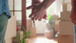 Pareja, llaves y cogidos de la mano en vivienda nueva, mudanza y cajas para reubicación, inmobiliaria o inversión inmobiliaria. Hombre, mujer y juntos con principio, crecimiento y futuro con cartón en salón - Vídeo de stock 4K
