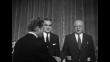 Dignitaries enter dining room with dais at left / Prince Axel of Denmark left, greets Rory Calhoun and his wife, Lita Baron, as Y Frank Freeman looks on / Danny Kaye shaking hands, Freeman at right / CU Axel / Kaye shakes hands with Axel, Prime Mister Hans Hedtoft at right / Kaye, Freeman and Axel from right [exact month/day not known]