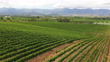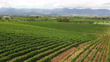 Drone shot of two tractors making their way through the rows of vineyards spraying chemicals. Farmers spray the vineyards early summer in the Breede River Valley near Cape Town.