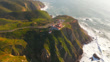 Aerial drone shot of lighthouse at Cabo da Roca in Portugal, westernmost point of Europe. Lighthouse stands on rugged cliff surrounded by green hills and winding roads. Waves crash against rocky shore as golden sunlight casts warm glow over landscape. Distant coastline stretches along Atlantic Ocean under clear sky.