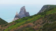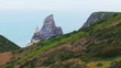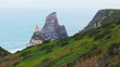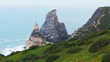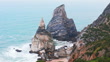 Drone shot of huge stack rocks at Praia da Ursa, Portugal. Towering rock formations rise from sandy shore as waves crash against rugged coastline. Steep cliffs and jagged peaks create a dramatic seascape. Remote and wild landscape showcases raw natural beauty along Atlantic Ocean, highlighting unspoiled coastal scenery.