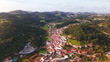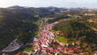 Aerial drone shot of townscape surrounded by lush greenery in Portugal on sunny day. Houses and buildings are scattered across the landscape, with fields and trees surrounding the town. The sunlight brightens the scene, highlighting the vibrant greenery and peaceful surroundings.
