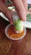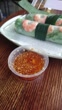 Hand dipping a spring roll in savory fish sauce - known as "Nem cuon" or "Goi cuon" in Vietnamese - made of boiled shrimps, vermicelli rice noodles, lecture, and other herbal vegetables