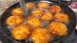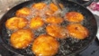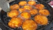 Slow motion capture of Idlis (made of rice flour dough) being deep fried at a roadside food cart.
