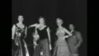 Title: "Havana Holiday - Monte Carlo of the Americas" superimposed over palm tree by the sea / MS Dodge convertible with four models pulling up in front of plane, / MS four models walking up steps to plane, sign on top of steps reads: "Tropicana Special", "Cubana" written on side of plane steps / Rear shot of models walking up plane steps, / MS models waving before entering plane with sign saying "Tropicana specials" on plane / CU plane taxiing to take off / Inside plane: passengers watch night club show / MS performers entertaining / CU performer beating on conga drum / CU man playing guitar / CU man blowing trumpet / CU man playing timbales / CU performers dancing / Front view passengers applauding, four models in foreground / Aerial plane approaching Havana, shoreline and buildings below / low angle front view four models deplaning at night in sports outfits as follows: Model #1: two pieces cotton travelers suit, boxy jacket with removable linen collar - sheath skirt; Model #2: two piece linen sheath dress with matching coat of solid color; Model #3: Three pieces checked linen coordinate ensemble; Model #4: Full circle skirt with abstract motif and long sleeved sweater with rhinestones and pearls / EXT. Night shot from Tropicana neon sign to Dodge convertible arriving with the 4 models now wearing evening clothes, one a turquoise semi-formal with lace and net, one a beige faille sheath cocktail dress, one a 14 carat gold gown and one black velvet with black net over white taffeta / side view of models playing slot machine / VS models gambling at roulette table / CU roulette spinning / CU models playing at roulette table / VS models seated at table in front of stage at night club watching entertainers / CU models applauding as entertainer bow / Note: exact day not known