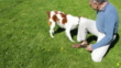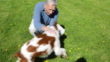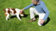 Healthy Senior Man Playing with his Springer Spaniel Dog in the backyard by the ocean