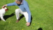 Healthy Senior Man Playing with his Springer Spaniel Dog in the backyard by the ocean - Vídeo de stock 4K