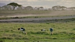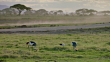 Wide shot of an ibis and grey crowned cranes grazing on the savanna landscape with trees in background / Kenya. Captured with Arri Alexa camera in Amboseli National Park.