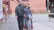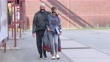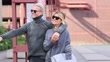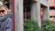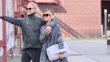 ESSEN, GERMANY - JULY 1: (SLOW-MO) (AUDIO OMITTED) Influencer Gitta Banko wears a grey pullover by loui.rocks x Antonia Zander, a long grey scarf with brown fringe detail by Antonia Zander, grey denim jeans pants by Dondup, cream-colored and black shoes by Chanel, a grey large clutch by Stuff Maker x Gitta Banko, a silver logo ring by Chanel and a gold lion necklace by Alighieri, and stylist Bert Sterck wears a dark and light grey knitted turtleneck pullover by Avant Toi and dark grey pants by Nili Lotan, all provided by loui.rocks, during a street style shooting at Zeche Essen on July 1, 2021 in Essen, Germany. (Footage by Streetstyleshooters/Getty Images)