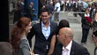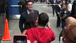 Josh Murray and Andi Dorfman exit the Good Morning America show and pose for photographers and with fans before leaving