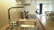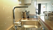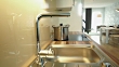 dolly move in kitchen with sink and ceramic stove top, living room in background