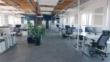 Panning shot of a large and spacious open plan office. Empty office with multiple work stations.