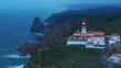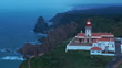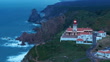 Lighthouse and cliffs over Atlantic Ocean at Cabo da Roca, the most westerly point of European mainland. Tower with red roof and white walls stands on rugged coastline as waves crash against steep cliffs. Vast ocean stretches to horizon under cloudy sky, creating dramatic and remote coastal scenery.