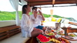 Sweet couple lover in boat touring are enjoy moment with meals lunch celebration together on boat floating at middle of the sea in summer season