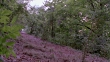 MEDIUM ANGLE OF A FOREST WOODS AREA WITH A PATH THROUGH THE MIDDLE. SEE A BEAT-UP BURGUNDY JAGUAR APPROACH. THEN SEE CLOUD OF DUST AS JAGUAR PASSES OFF SCREEN.