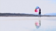 Middle aged woman skater is pulled by umbrella across a frozen lake - Vídeo de stock HD