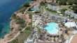 Buildings and Landmarks: Aerial of Panning on tourist resort on cliff by sea during sunny day