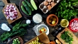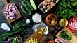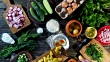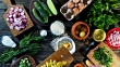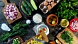 Preparing okroshka, Russian traditional cold soup with kvass. Putting chopped ingredients into the bowl. Overhead view