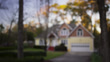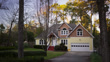 Rack focus to a wide exterior shot of a colorful two story, family home surrounded by trees. Cars pass on a street nearby and a long driveway leads to the home.