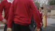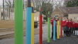 Gimble - Line of smiling laughing school pupils taking it in turn to run through large coloured pencils in elementary playground during break, friendship, togetherness, carefree