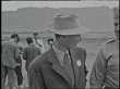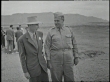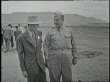 Scientist J. Robert Oppenheimer and U.S. General Leslie Groves talk together at an atomic test site in Los Alamos, New Mexico.