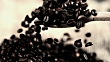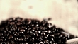 Super slow motion close up shot of scooping coffee beans with a wooden spoon.