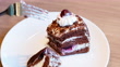 slow motion close up hand use fork cut slice of chocolate black forest cake with berry in plate on table
