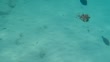 A smooth trunkfish, along various triggerfish and yellow goatfish, swim in the clear shallow waters of Aruba.