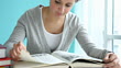 Pretty female student, reading a text book.