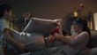 Tres hermanos de almohadas asiáticas se pelean mientras ven dibujos animados en vivo en la sala de estar de su casa. Noche - Vídeo de stock 4K