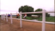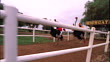 Track left following jockeys riding ostriches in race, Oudtshoorn, South Africa Available in HD.