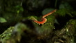 A velvet worm crawls on a moss-covered branch.