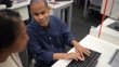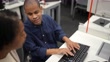 Visually impaired man using the computer with help from a mature woman at university