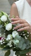Woman holding a beautiful bouquet of white flowers and eucalyptus. Woman has elegant nude manicure.