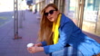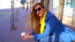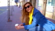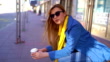 Young Caucasian woman with coffee waiting for bus at the station. Slow motion.