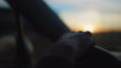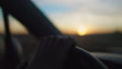 A woman's hand grips a steering wheel while driving on a road trip at sunset.